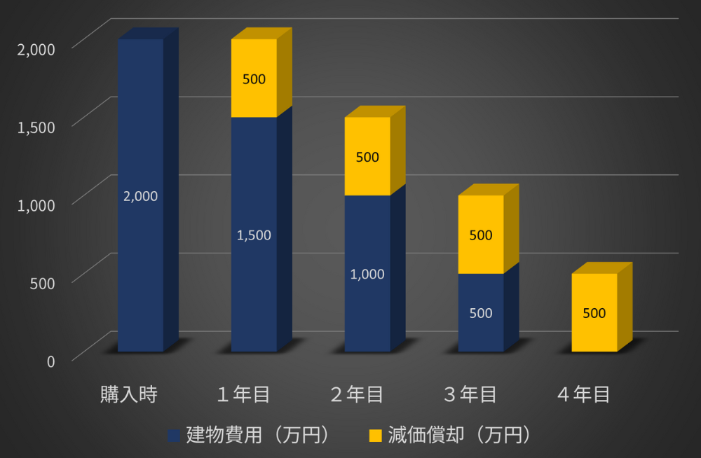 A. 法定耐用年数を過ぎた中古建物を購入した場合、税法上の規定により、「簡便法」という方法で耐用年数を再計算できます。この結果、建物価格を4年間で均等償却できることがあり、それを「4年償却」と呼びます。